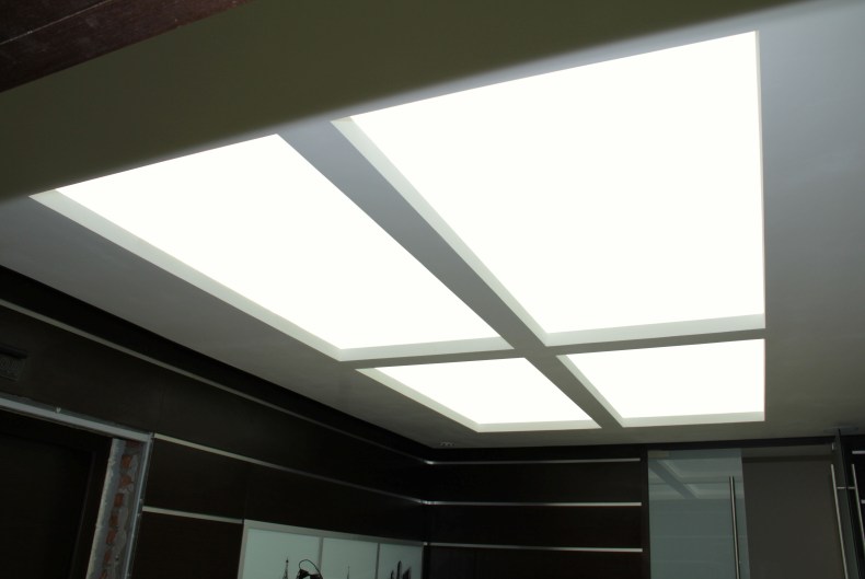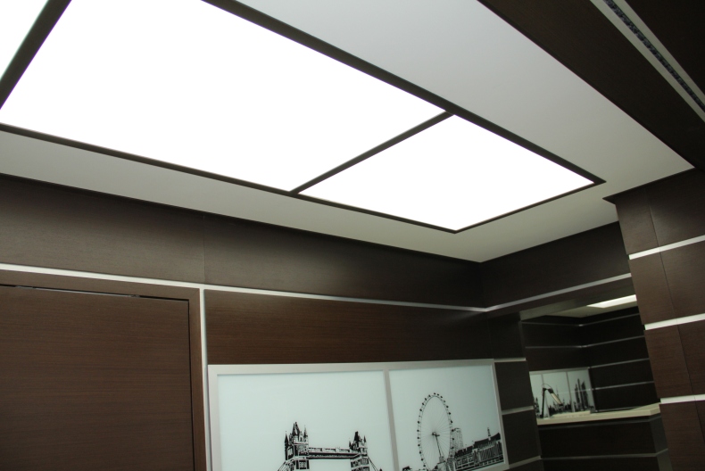 Использовались светодиодные панели размером: потолочные в зоне ресепшн 970х2900 мм. потолочные в корридорах 800х1000мм.