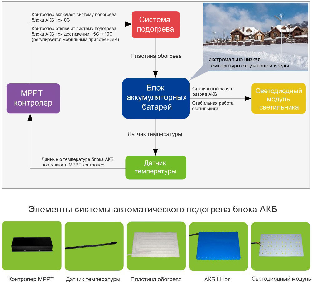 Функция автоматического подогрева блока аккумуляторов предназначена для поддержания положительных температур в блоке аккумуляторов в осенне-зимний период. Данная функция обеспечивает стабильный заряд и разряд аккумуляторов во время низких и экстремально-низких температур окружающей среды, что позволяет светильнику безотказно работать в полностью автономном режиме без затухания или вовсе отключения в ночное время.