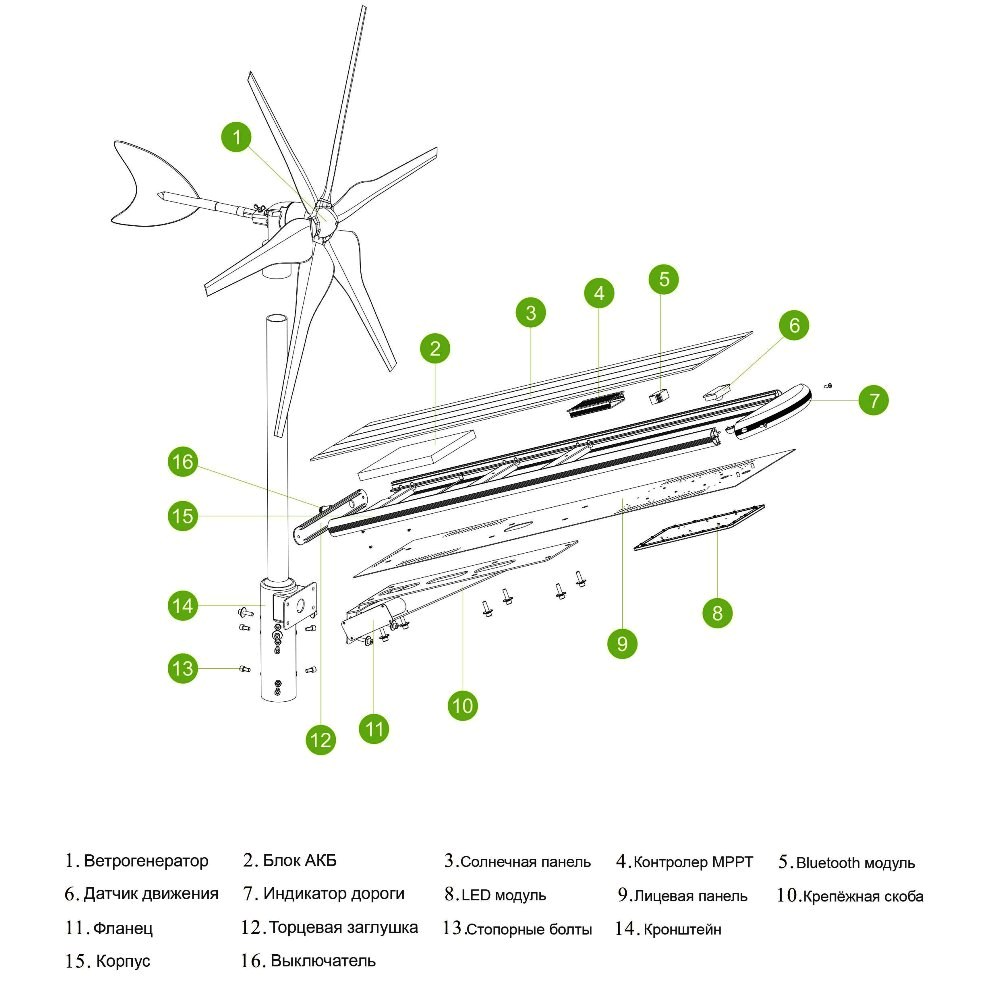 Электронная тормозная система: тормозная система включается автоматически при скорости ветра более 30-35 м/с, исключая чрезмерные нагрузки на генератор.