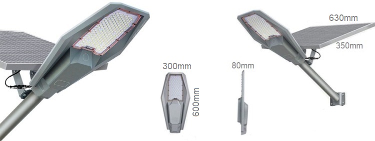 Мощность: 150 Вт Световой поток: 15000 Лм Время освещения: 24 часа Время зарядки: 6-8 часов при солнечной погоде Солнечная батарея: 6В 40Вт; размер 630х350мм Емкость батареи: 3,2В 40Ач аккумулятор LiFePo4 морозостойкий Площадь освещения: до 150 м2 Материал корпуса: анодированный алюминий сплав + поликристаллическая панель Пылевлагозащита корпуса: IP65 Светодиоды: Samsung LED SMD5730 300шт Ресурс работы: 50000 часов Включение: фотоэлемент Высота установки: 5-8 метра Размер светильника: 300х600х80мм Гарантия: 2 года