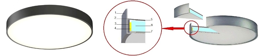 1. Корпус-алюминиевый сплав: окрашенный по RAL порошковой краской 2. Крышка-ударопрочный полистирол: герметичная защита оптической и электрической части 3. Алюминиевая обечайка: теплоотвод 4. Светодиоды Samsung LED: 140Лм/Вт 84cRa 5. Светоблокирующая пленка: снижение световых потерь 6. Светорассеивающая пластина-матрица; равномерное распределение светового потока 7. Рассеиватель-диффузор: обеспечение мягкого рассеянного освещения