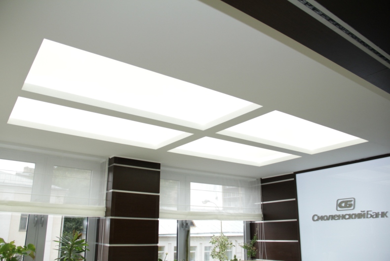 Светодиодные панели не стандартных размеров произведены по техническому заданию технической службы банка "Смоленский", установлены в зоне ресепшн и корридорах.