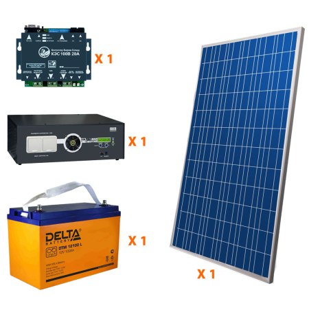 Комплект включает в себя: 1) Солнечная батарея Delta BST 250-24P (250Вт, 24 В) 2) Солнечный контроллер КЭС 100/20 (20а) 3) АКБ Delta DTM 12100 (100 а*ч) 4) Инвертор MAP PRO 1,3 кВт (12 В, чистый синус, кратковременная мощность до 2500 Вт) 5) Полный комплект кабелей и коннекторов. 7) Крепеж (либо на стену, либо на крышу) 8) Схема соединения и описание.