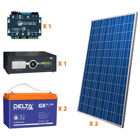 Комплект включает в себя: 1) Солнечная батарея Delta BST 250-24P (250Вт, 24 В) - 2 шт 2) Солнечный контроллер КЭС 100/20 (20а) - 1- шт 3) АКБ Delta GEL 12100 (100 а*ч) - 2 шт 4) Инвертор МАП SIN HYBRID 2 кВт (12 В/24В, чистый синус, кратковременная мощность до 3500 Вт) - 1шт 5) Полный комплект кабелей и коннекторов. 7) Крепеж (либо на стену, либо на крышу) 8) Схема соединения и описание.