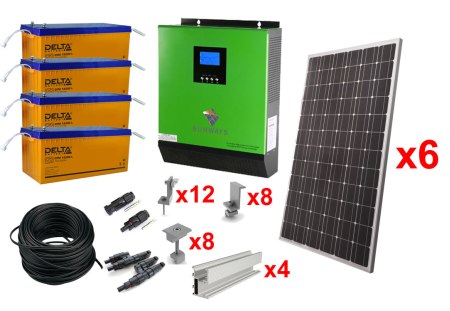 1) Солнечная батарея Delta BST 250-24M (250Вт, 24в) - 6 штук 2) Контроллер заряда Sunways SSP 5kVA 60A MPPT (60А, 48в) 3) АКБ Delta DTM 12200 L (200а/ч) - 4 штуки 4) Коннекторы МС-4 - 2 штуки 5) Коннектор МС4 параллельный - 2 штуки 6) Провод 2х4 20м 7) Рейлинг для солнечных панелей, 3400мм - 4 штук 8) L-образный крепеж для солнечных панелей - 12 штук 9) Концевой зажим для солнечных панелей - 8 штуки 10) Центральный зажим для солнечных панелей - 8 штук 11) Схема соединения и описание.